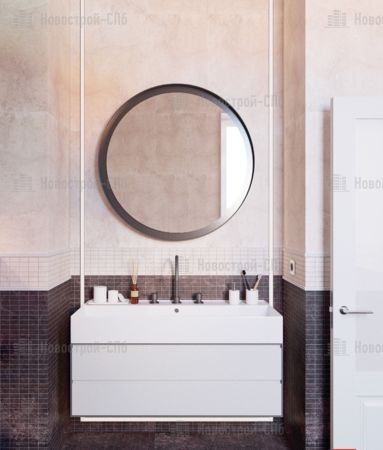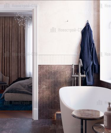 - В санузлах будут установлены ванны размером 1700х700 мм с экранами, оснащенными корзинами для хранения и шторкой из закаленного стекла; раковины из литьевого мрамора с декоративным вкладышем, навесной тумбой под раковину и зеркалом-шкафом с подсветкой; смесители и душевые гарнитуры Jacob Delafon Aleo (Франция); унитазы с сиденьем из дюропласта с микролифтом Sanita (Россия). В дополнительных санузлах (где это предполагается планировкой) будут установлены душевые уголки.