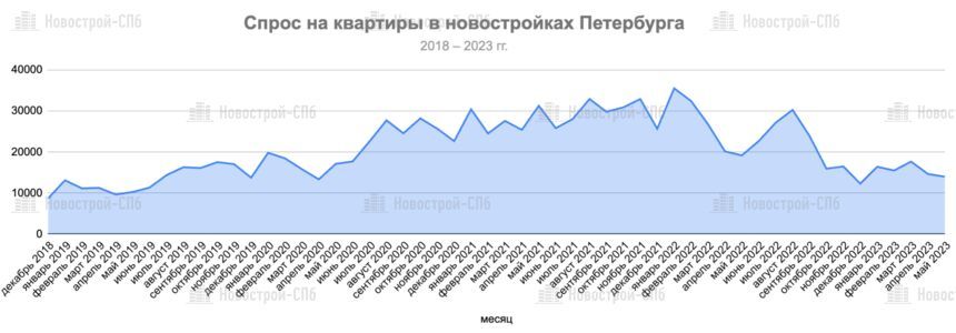 В целом, по итогам первых пяти месяцев 2023 года – с января по май включительно – покупательский спрос на новостройки в Петербурге снизился на 41,67% относительно аналогичного периода прошлого года, на 43,82% относительно января–мая 2021 года.