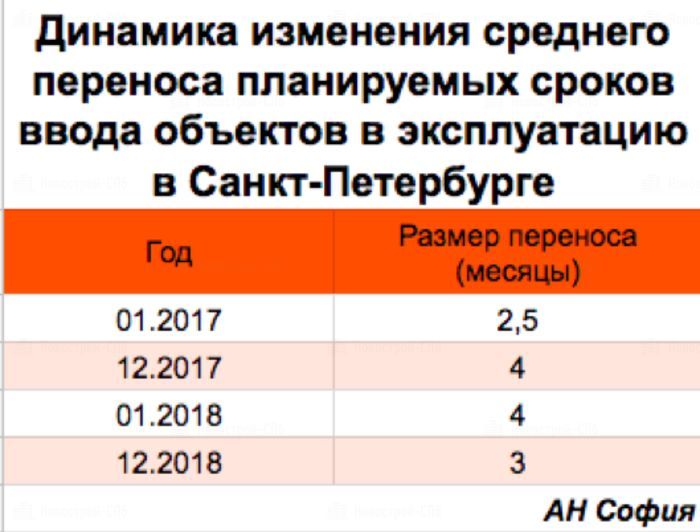 Средний перенос сроков введения жилых проектов рос весь 2017 год, а в 2018 году этот показатель, наоборот, медленно, но сокращался. Так, по данным аналитиков АН «София», с 4 месяцев этот показатель сократился до 3 месяцев.