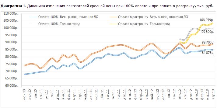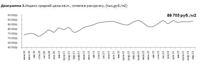 При оплате в рассрочку средняя цена кв. метра предложения составляет 88 703 рублей, что на 0,91% больше, чем в марте’2013 г. За год (с января 2012 года) средние цены в целом по рынку выросли на 2,59%.