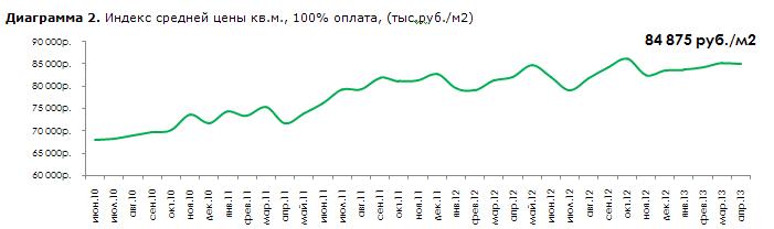 При 100% оплате средняя цена кв. метра предложения составляет 84 875 рублей, что на 0,37% меньше, чем в марте’2013 г. За год (с января 2012 года) средние цены в целом по рынку выросли на 6,83%.