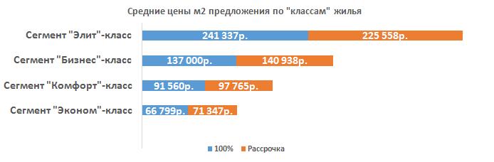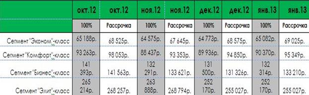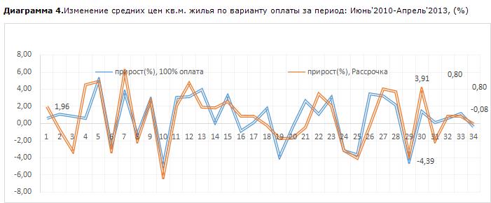 Сегмент жилья «комфорт-класса» по итогам апреля, напротив, относительно января’2013 подешевел как при 100% оплате, так и в рассрочку: (-0,52%) и (-0,47%), соответственно. Сегмент жилья «бизнес-класса» подорожал относительно января’2013 в сравнении сжильем других классов более значительно, особенно при оплате в рассрочку (+4,90%), при 100% оплате (+3,43%). Сегмент жилья «элит-класса» по итогам апреля’2013 подешевел относительно января’2013, как при 100% оплате, так и в рассрочку: -0,12% и -0,33%, соответственно.