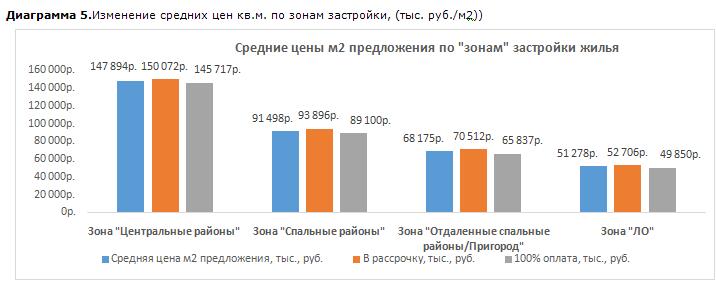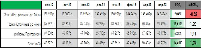 Изменение средних цен кв. метра предложения по зонам застройки в апреле’13 показывает разную динамику. С сентября 2012 по конец апреля 2013 наблюдается увеличение средних цен кв. метра предложения во всех зонах застройки.