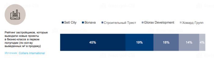 В первом полугодии 2018 года пул застройщиков на рынке бизнес-класса, с одной стороны, укреплял свои позиции, о чем свидетельствовали анонсированные крупными девелоперами проекты в разных районах города, а с другой — пополнялся новыми игроками. В этом году компания Glorax Development, имеющая большой опыт реализации объектов в сегменте «комфорт+», вышла на рынок с первым премиальным проектом. Расширила свой портфель в бизнес-классе и «Ховард Групп», ранее представленная в сегменте «делюкс». К профессиональным девелоперам жилья в этом году также присоединится известный на рынке коммерческой недвижимости холдинг «Адамант»: компания получила разрешение на строительство небольшого дома, площадью около 8 000 кв. м в Адмиралтейском районе.