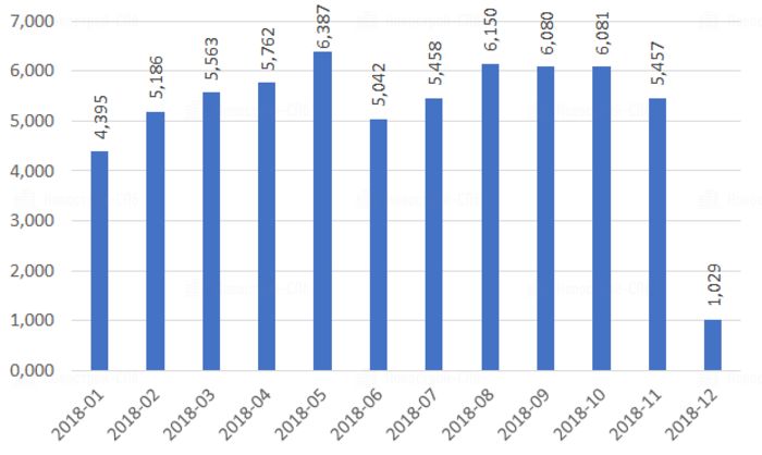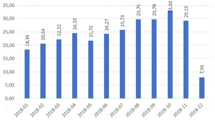 Динамика изменения валовой выручки застройщиков помесячно в 2018 г., млрд руб. (Ленинградская область)