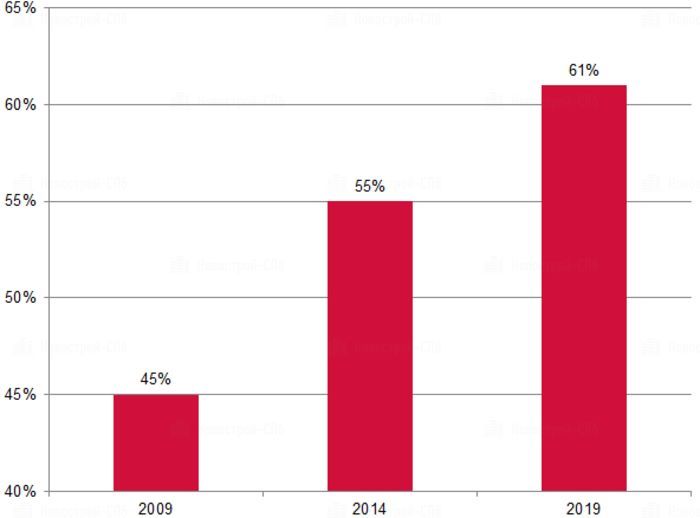 За полгода доля крупных девелоперов в объеме предложения жилья в Санкт-Петербурге выросла почти на 10 п.п., преодолев отметку в 60%. Это предвещает монополизацию рынка жилья. Практически с начала 2000-ых гг. первая десятка девелоперов обеспечивала порядка 40-45% предложения, по итогам I полугодия 2019 года их доля превысила 60%, а в ближайшие несколько лет, по прогнозам Knight Frank St Petersburg, будет стремиться к 80%.