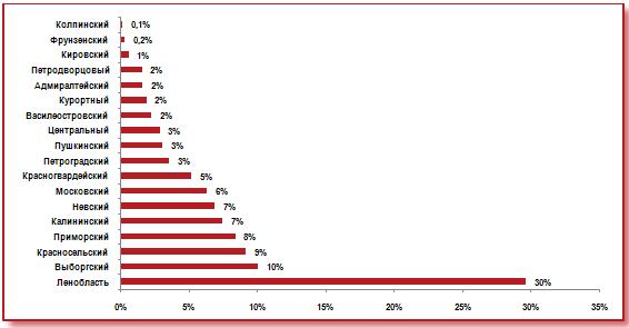 57% предложения (в кв. метрах) приходится на Выборгский (10%), Красносельский (9%)и Приморский (8%) районы Санкт-Петербурга и ближайшую область (30%). Основные зоны концентрации квартир эконом-класса – ближайшая область (Бугры, Колтуши, Кудрово, Мурино) и окраины города (Парнас, Парголово, Шушары).
