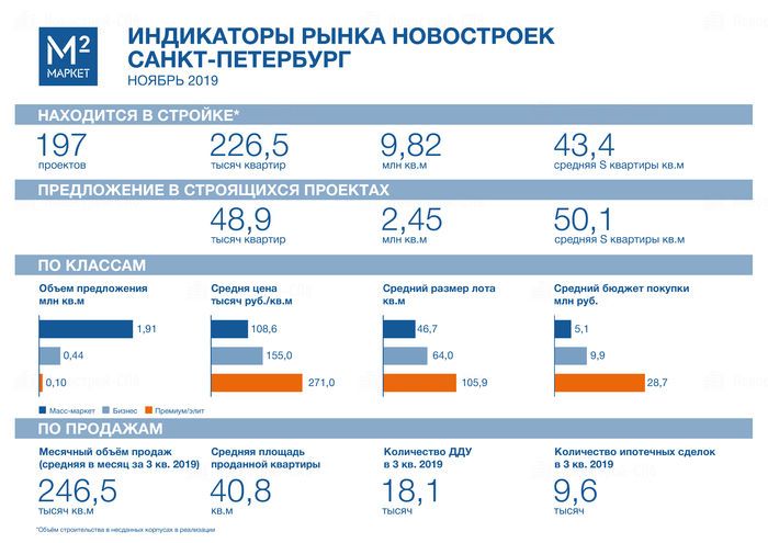 Порядка 78% всего предложения сосредоточено в масс-маркете (новостройки эконом, комфорт и комфорт+ класса). В ноябре 2019 года средняя площадь предложения в данном классе составила 46,7 кв.м, средний бюджет покупки превышает 5 млн руб.