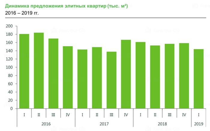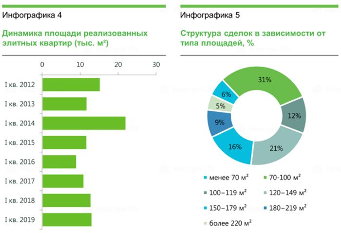 По итогам I квартала 2019 г. было реализовано 13,1 тыс. кв. м элитного жилья, что незначительно превышает показатель I квартала 2018 г. на 2%.