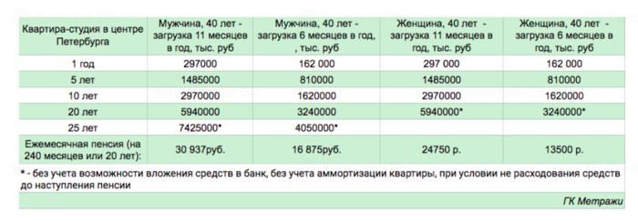 В результате пенсионной реформы возраст выхода на пенсию для мужчин вырос до 65 лет, а для женщин — до 60 лет. Таким образом, сорокалетний мужчина сможет копить на пенсию 25 лет, а женщина — 20 лет. Согласно результатам подсчета, при выходе на пенсию владелец небольшой квартиры сможет получать дополнительный доход к пенсии от 13 до 31 тысячи рублей в месяц.
