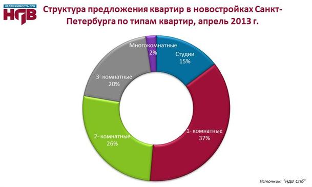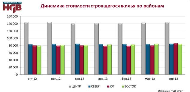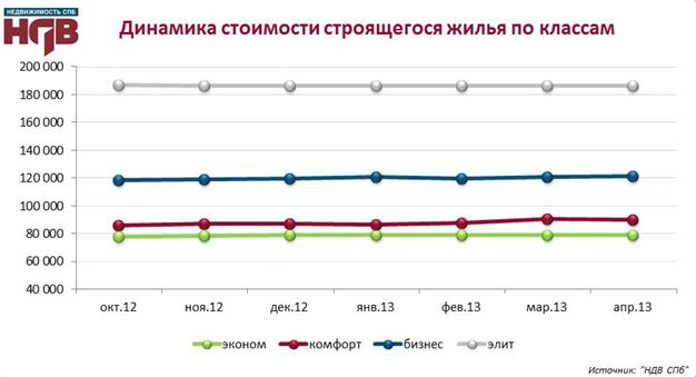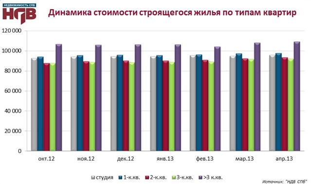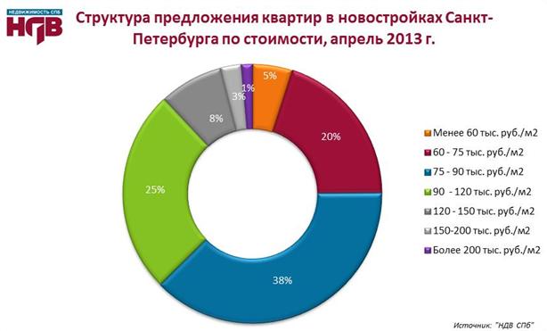 В апреле 2013 года средняя стоимость квадратного метра жилья в строящихся домах Санкт-Петербурга составила 97 514 рублей. Структура предложения за прошедший месяц претерпела некоторые изменения. Доля категории до 60 000 рублей/кв. метр увеличилась на 3 п.п., что обусловлено значительным предложением объектов в сегменте «эконом». Доля квартир в диапазоне 150 000 – 200 000 осталась практически неизменной. Все остальные ценовые категории потеряли за месяц от 1 п.п. до 3 п.п.