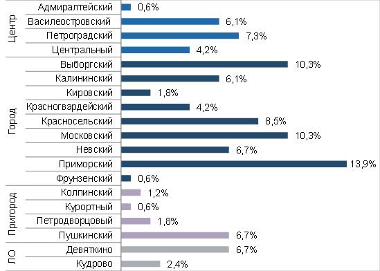 По подсчетам аналитиков ГК «Пионер», по количеству введенных квадратных метров лидером стал Приморский район, где завершено строительство 42 750 кв. м, в составе трех многоквартирных домов на 920 квартир. По количеству жилых комплексов, квартиры в которых представлены в продаже, лидирует Приморский район, за ним следуют Выборгский и Московский районы.