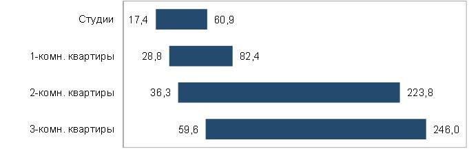 Согласно данным исследования ГК «Пионер», сохраняется тенденция вывода на рынок квартир минимальной площади. Так, квартиры до 25 кв. метров представлены в 16% жилых комплексов. Несмотря на более высокую цену квадратного метра подобных объектов, их общая стоимость все-таки ниже, чем, например, 40-метровой однокомнатной квартиры, и в большей степени отвечает платежеспособному спросу покупателей жилья эконом-класса.