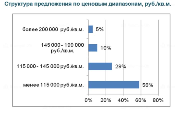 Цена квадратного метра составляет менее 115 тысяч рублей в 55% объектов, выставленных на продажу в новостройках. Более дорогие квартиры (до 145 000 рублей за кв. м.) занимают 29% от общего числа объявлений. А сегмент, где диапазон цен за квадратный метр варьируется от 145 до 200 тысяч рублей, составил всего 10%. Остальные предложения относятся к категории элитной недвижимости – 5%.