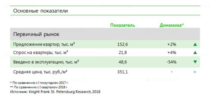По итогам I полугодия 2018 года общая площадь представленных в продаже квартир составила 152,6 тыс. кв. м (1,2 тысяч квартир). Незначительный рост предложения (+2%) по сравнению с I полугодием 2017 года обусловлен выходом в продажу в конце 2017 года проекта на Петровском острове — Neva Haus.