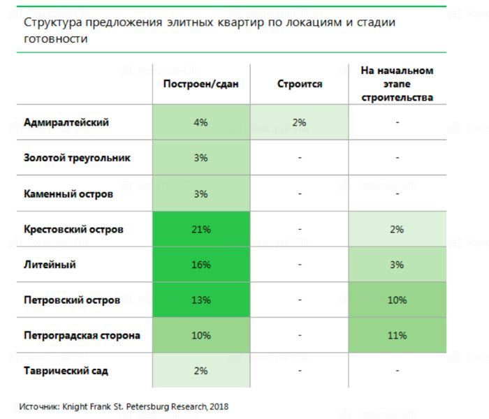 Сокращение темпов вывода на рынок новых элитных проектов, а также планомерное повышение строительной готовности экспонируемых объектов привело к тому, что более 70% оставшегося в продаже предложения сконцентрировано в готовых объектах, причем наибольшее количество площадей представлено в локациях Крестовского и Петровского островов и Литейного проспекта. Заметными событиями элитного рынка стали завершение продаж квартир в д. 13 на Конногвардейском бульваре, а также ввод в эксплуатацию комплекса «Русский дом» в Басковом переулке, д. 2.
