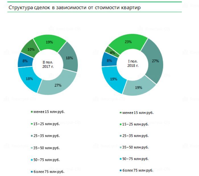 По итогам июня 2018 года средняя цена квадратного метра элитной квартиры на первичном рынке составила 351,1 тыс. руб. Показатель сохранился на уровне I квартала 2018 года. Средний бюджет сделки за полугодие вырос на 5% и составил около 41,2 млн руб. Существенный рост количества реализованных квартир был зафиксирован в ценовых категориях менее 15 млн руб. (на 6 п. п.) и 35–50 млн руб. (на 8 п. п.).