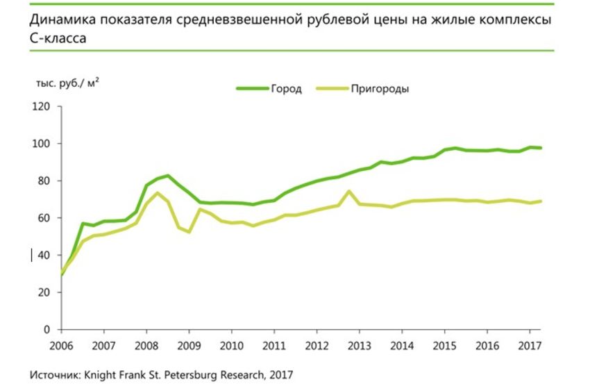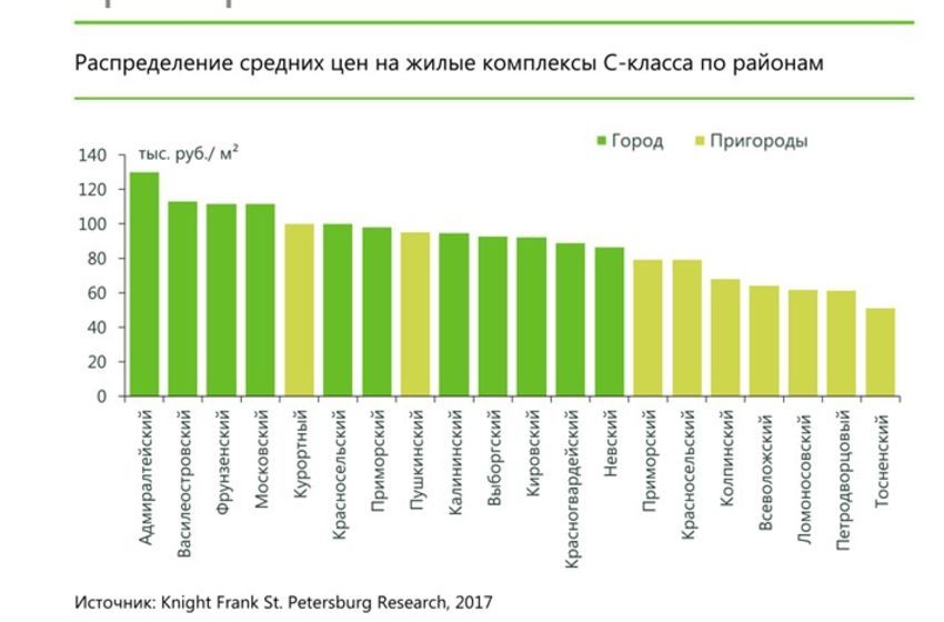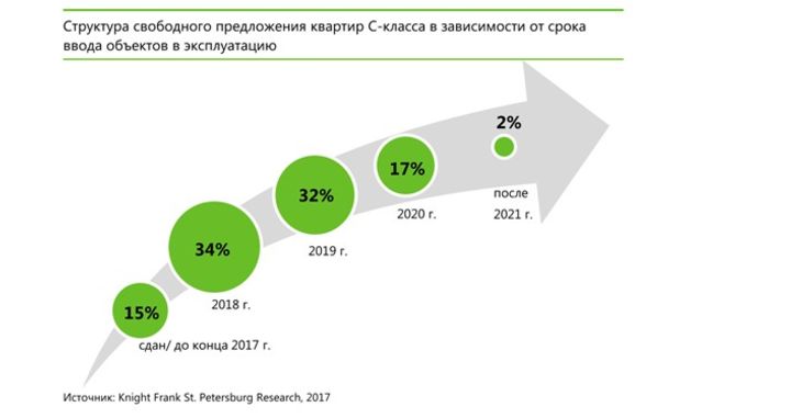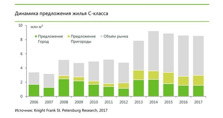 С начала 2017 г. на первичный рынок выведено в продажу 2,11 млн кв. жилья С-класса, из которых на проекты, расположенные в Санкт-Петербурге приходится 64% площадей. Основной объем выведенных на рынок площадей сосредоточен в жилых комплексах, строящихся на окраинах сформированных кварталов, либо на месте бывших промышленных площадок.