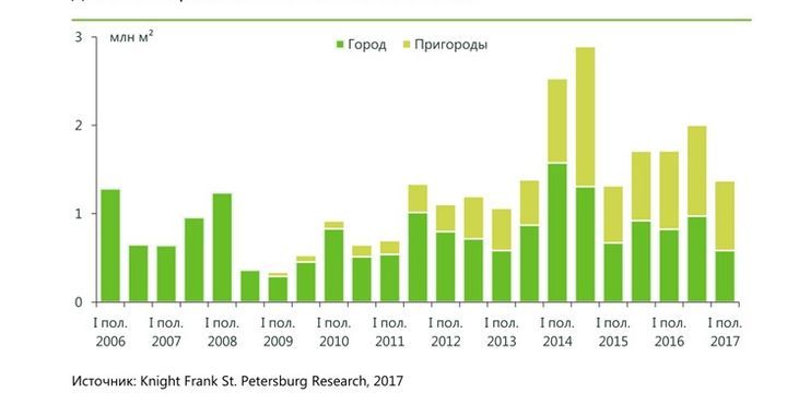 По итогам I полугодия 2017 г. в Санкт-Петербурге и ближайших пригородах количество свободного предложения составило 2,96 млн кв. м жилья класса С, что составляет 35% от совокупной площади экспонируемых объектов.