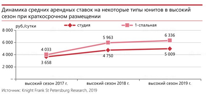Средний уровень арендных ставок в действующих апарт-отелях в высокий сезон 2019 г. (апрель-июль) составил 5 тыс. руб./сутки за студию и 6,4 тыс. руб./сутки за юнит с 1 спальней (при краткосрочном размещении). Данные итоги выше показателей прошлого сезона в среднем на 6%.