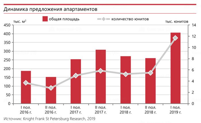 В I полугодии 2019 г. в Санкт-Петербурге и области в продаже находилось рекордное количество апартаментов – 11,7 тыс. юнитов. Этот показатель достиг максимума за весь период реализации апартаментов на рынке.