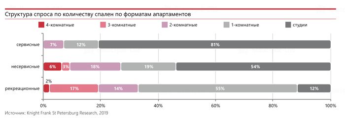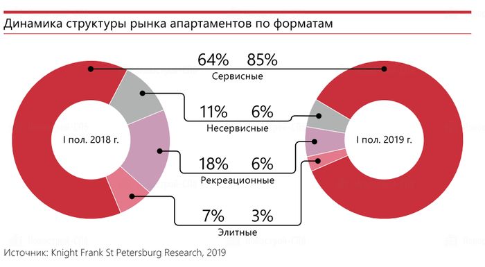 Светлана Московченко, руководитель отдела исследований Knight Frank St Petersburg, отмечает, что в структуре предложения по-прежнему наибольшая доля приходится на сервисные апартаменты (+21 п.п. по сравнению с 2018 г.), которые постепенно вытесняют другие форматы на рынке.