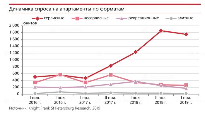 По итогам I полугодия 2019 года на рынке апартаментов, спрос на этот формат недвижимости вырос на 11% по сравнению с аналогичным периодом 2018, об этом сообщают аналитики Knight Frank St Petersburg. Если говорить о предложении, то 85% приходится на сервисные апартаменты – объекты под управлением профессиональных управляющих компаний, с сервисами по уборке и другими службами поддержки.