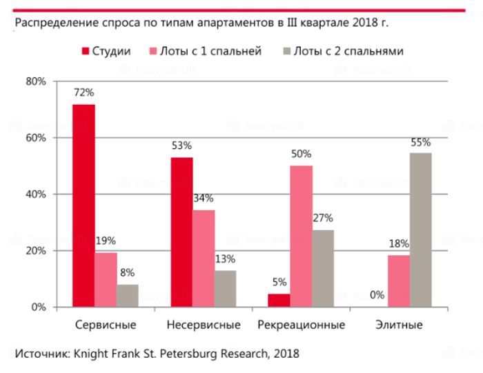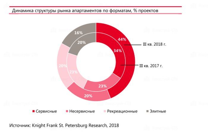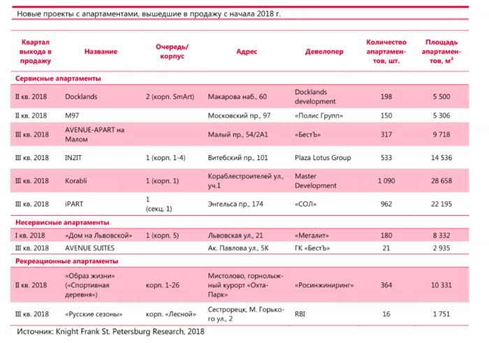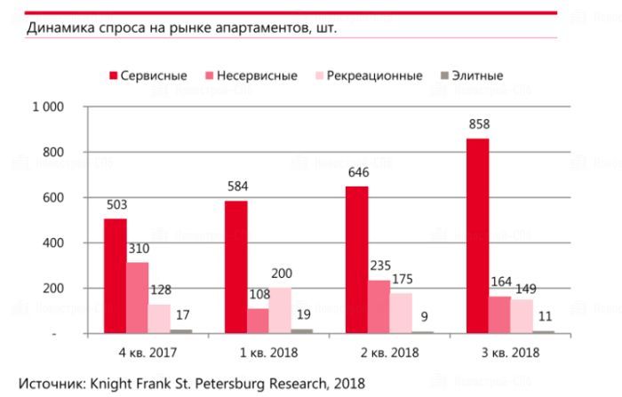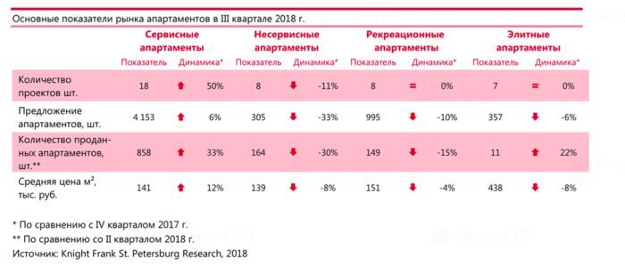 По оценкам Knight Frank, к концу III квартала 2018 года продажи велись в 41 комплексе апартаментов, что на 14% больше по сравнению с итогами 2017 года. Суммарная площадь строящихся проектов, находящихся в продаже, достигла рекордного значения в 641 тыс. кв. м. Средневзвешенная цена квадратного метра апартаментов сервисного формата составила 141 тыс. руб. Спрос на апартаменты всех форматов за три квартала 2018 года увеличился на 74% по сравнению с аналогичным периодом прошлого года.