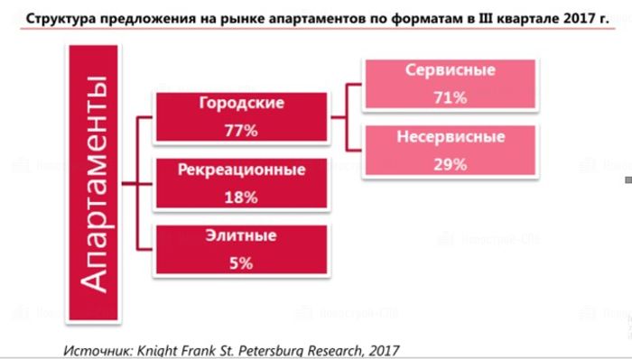 Самыми распространёнными типами апартаментов в строящихся городских проектах являются студии и лоты с 1 спальней небольших площадей, на их долю приходится 48% и 15% соответственно. «Это связано с тем, что на рынке преобладают сервисные комплексы апартаментов с полной отделкой и меблировкой, рассчитанные на краткосрочную и долгосрочную сдачу в аренду», - комментирует Светлана Московченко, руководитель отдела исследований Knight Frank St Petersburg.