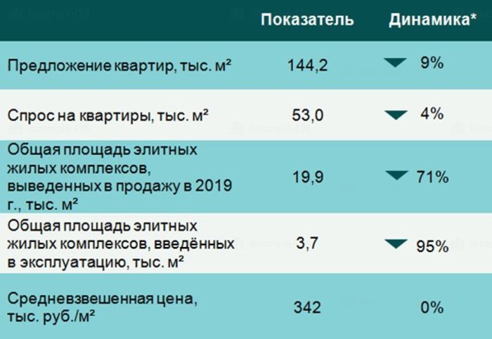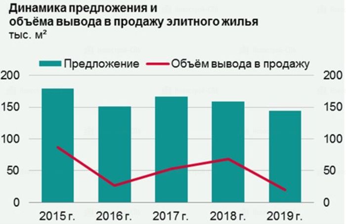 Кроме того, 2019 г. был отмечен слабой активностью девелоперов относительно ввода в эксплуатацию элитных жилых комплексов. В 2019 г. был введён только 1 элитный объект – Art View House общей площадью 3,7 тыс. кв. м. Большинство элитных комплексов (71%) на рынке сданы и обеспечивают 44% всего предложения жилых площадей в продаже.