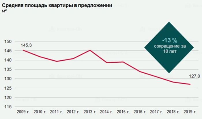 По каждому типу квартир в предложении происходит постепенное уменьшение средних площадей, доля просторных квартир на рынке сокращается за счет вымывания ассортимента и преобладания более компактных квартир в новом предложении. За последнее десятилетие средняя площадь квартиры в предложении уменьшилась со 145,3 кв. м до 127 кв. м.