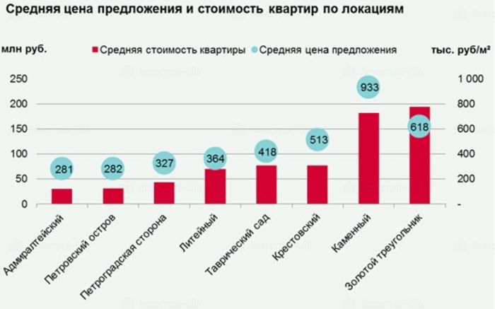 Наиболее доступное по стоимости жильё предлагается в локациях «Адмиралтейский» и «Петровский остров» – около 31 млн руб.