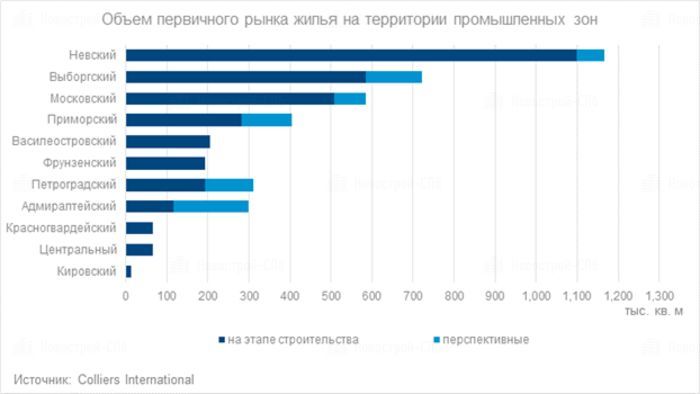 Второе и третье место занимают Выборгский и Московский районы, где объём строящегося на данный момент в промзонах жилья оценивается в 585 тыс. кв. м и 507 тыс. кв. м соответственно. Крупнейшие площадки редевелопмента в этих районах – мясокомбинат «Самсон», а также территории заводов «Светлана» и «Новый Лесснер».