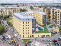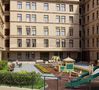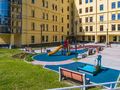 Территория клубного дома благоустроена: высажены кустарники и газоны, установлены лавочки, прогулочная зона декорирована брусчаткой. Во внутреннем дворе дома установлена современная игровая площадка с мягким и безопасным покрытием.