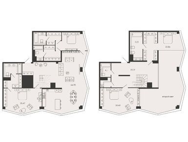 Всего в комплексе представлено 1026 лотов, основная часть которых видовые, с панорамными высокими окнами или собственными террасами. Среди планировок есть уютные студии с приватными спальными зонами и выделенными гардеробными, компактные однокомнатные квартиры с видом на Невскую губу, варианты евроформата с большими лоджиями и угловым остеклением, уникальные резиденции с анфиладным мастер-блоком, «зимним садом» и антресолью. Две башни, соединенные зеркальным мостом, отведены под 12 обширных пентхаусов, внутри которых – 6 спален, каминные залы, 7-метровые потолки, окна во всю стену. Квартиры оборудуют инновационной инженерией, жители смогут удаленно управлять коммуникациями, контролировать освещение, кондиционирование и подачу тепла. Лоты передаются владельцам в отделке «white box».