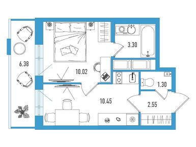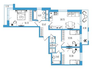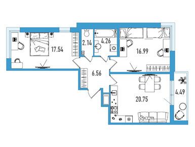 Квартирный фонд комплекса включает студии и лоты евроформата с 1-3 спальнями, площадь которых варьируется от 30 до 90 кв. м. В каждой планировке спроектированы трехметровые потолки, широкие окна и отдельные прихожие, в том числе, с нишами под гардеробный шкаф. Во всех квартирах есть балконы или лоджии площадью от 3.17 кв. м с холодным остеклением. В двух- и трехкомнатных лотах предусмотрены дополнительные ванные комнаты.