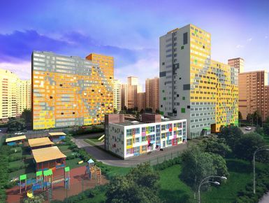 навесных панелей, цветной штукатурки и декоративного кирпича. Четыре семиэтажные секции,