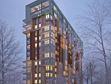 Общественные пространства дома оформлены в единой концепции с архитектурой. Холл украшают резные колонны, полы облицованы мрамором, акцентные вставки из дерева на стенах отсылают к эстетике старорусских теремов. В парадном вестибюле продуманы комфортные лаунж-зоны с дизайнерской мебелью, для освещения подобраны хрустальные люстры в виде объемных сфер.