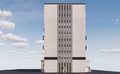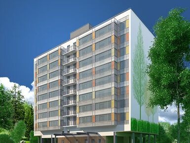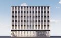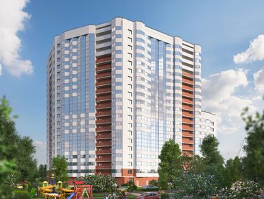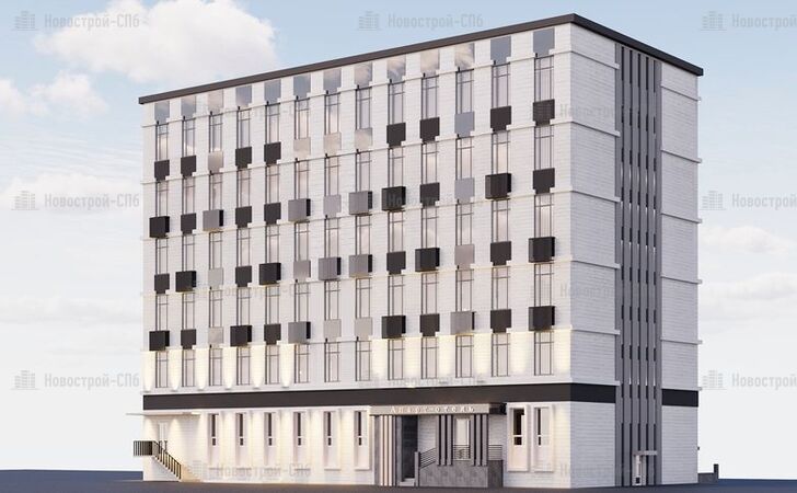 В проекте возведен корпус средней этажности, высотой в 6 этажей. Фасады отделаны светлым кирпичом и декорированы темными монолитными плитами, французские балконы и корзины для кондиционерных блоков лаконично вписываются в архитектуру.