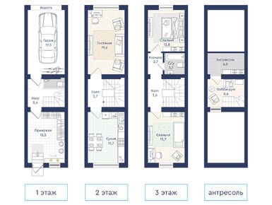 Метраж планировок стартует от 69 кв.м: двухэтажные лоты с двумя спальнями и антресолью для хранения под крышей. Таунхаусы с собственным гаражом имеют трехэтажную планировку от 120 кв.м. и включают три комнаты. В некоторых таунхаусах предусмотрено оборудование террас на крыше. Лоты сдаются без отделки.