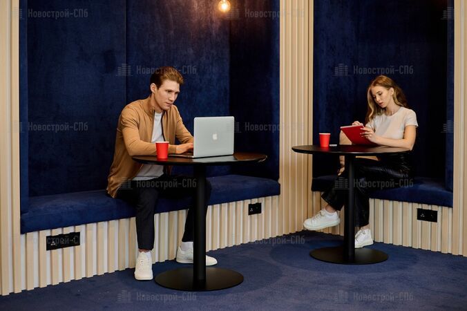Зона коворкинга с оборудованными местами для работы занимает более 37 кв. м, здесь могут разместиться до 10 человек одновременно. Специально для организации деловых встреч предусмотрена переговорная комната. В дневное время коворкинг используется жителями для работы, а в вечернее (после 19:00) – это пространство для проведения настольных игр и мастер-классов.
