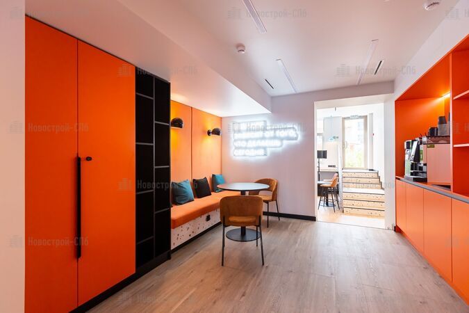 Комьюнити-центр в жилом комплексе Golden City расположен в коммерческом помещении на первом этаже жилого дома. Площадь соседского центра – 180 кв. м, функционально он разделен на несколько зон и включает в себя кинозал, коворкинг, зал для занятий спортом, переговорную и детскую комнату. Все пространство продумано как максимально мультиформатное и позволяет легко менять назначение использования. Для отдыха и общения, а также организации кинопоказов в комьюнити-центре организована зона кинотеатра. А перекусить и выпить вкусный кофе можно в зоне кофе-пойнта.