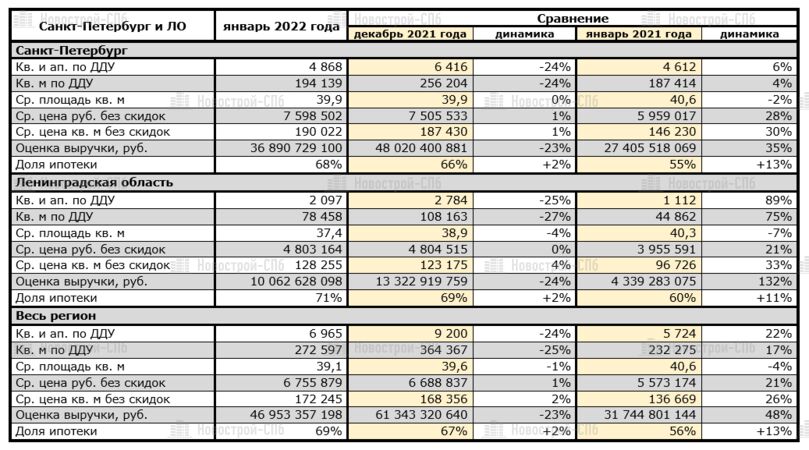 Аналитик Александр Пыпин, руководитель проекта DataFlat подготовил статистику по продажам квартир и апартаментов в Санкт-Петербурге и Ленобласти за январь 2022 года, основываясь на данных Росреестра, и сравнил показатели с прошлым месяцем и январем 2021 года.