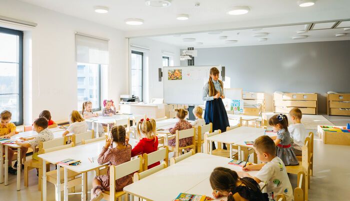 При строительстве зданий и оформлении интерьеров используются только безопасные материалы, выбираются природные цвета и фактуры. Благодаря большим окнам в учебных классах всегда много света. Вокруг зданий — благоустроенная территория с газонами, кустарниками и деревьями, где дети могут гулять и играть.