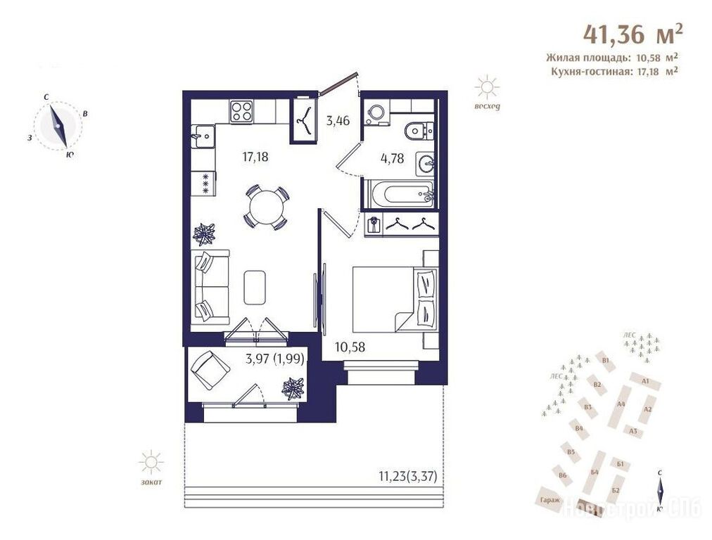 Продается однокомнатная квартира в новостройке ЖК Ranta Residence (Ранта Резиденс) по адресу Санкт-Петербург, Курортный, Зеленогорск, Кривоносовская улица, 57, ЖК Ranta Residence, корпус Б3. Общая площадь квартиры - 41.36 кв. м. , компания-застройщик — LAR Development (ЛАР Девелопмент), Запстрой, СЗ Ранта Резиденс. Стоимость квартиры — 17 784 800 руб. Способы оплаты можно уточнить у продавца. Срок сдачи — 2 квартал 2026. Более подробная информация по телефону.