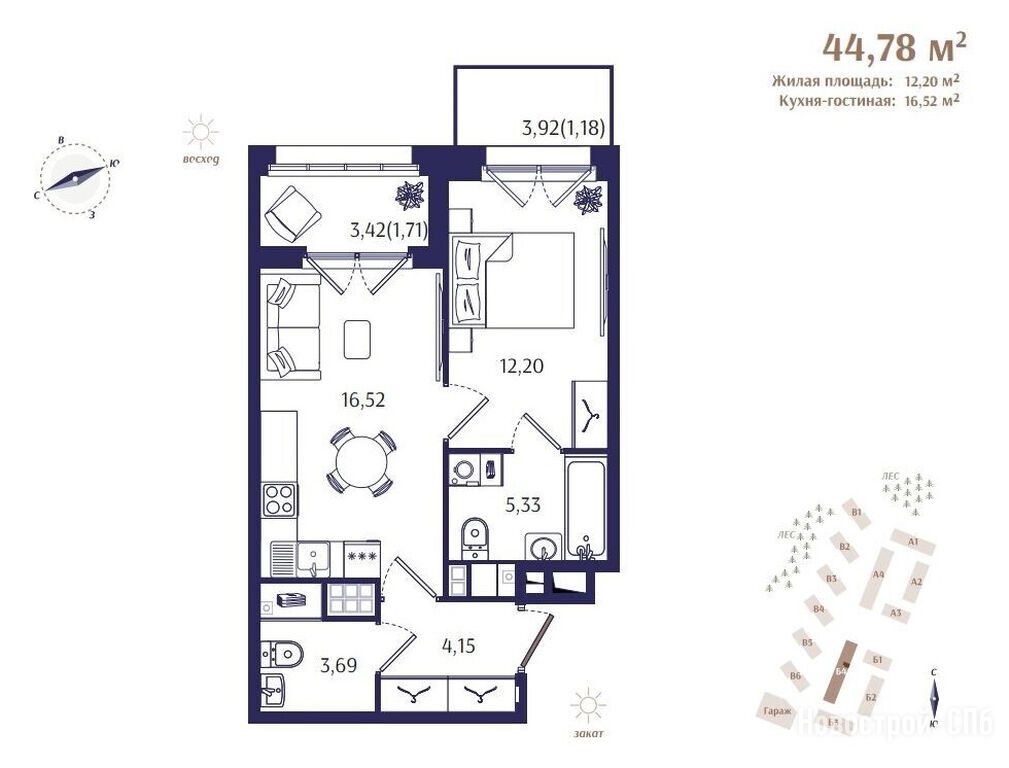 Продается однокомнатная квартира в новостройке ЖК Ranta Residence (Ранта Резиденс) по адресу Санкт-Петербург, Курортный, Зеленогорск, Кривоносовская улица, 57, ЖК Ranta Residence, корпус Б4. Общая площадь квартиры - 44.78 кв. м. , компания-застройщик — LAR Development (ЛАР Девелопмент), Запстрой, СЗ Ранта Резиденс. Стоимость квартиры — 18 807 600 руб. Способы оплаты можно уточнить у продавца. Срок сдачи — 2 квартал 2026. Более подробная информация по телефону.
