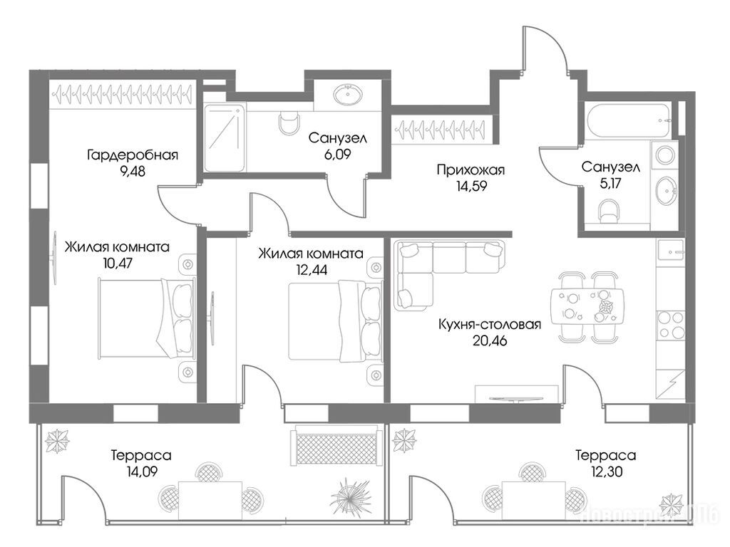 2-комн. апартамент, 86.62 м2, 1 этаж