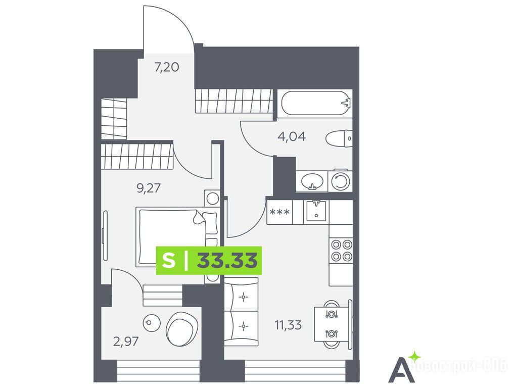 2-комн. квартира, 33.33 м2, 3 этаж