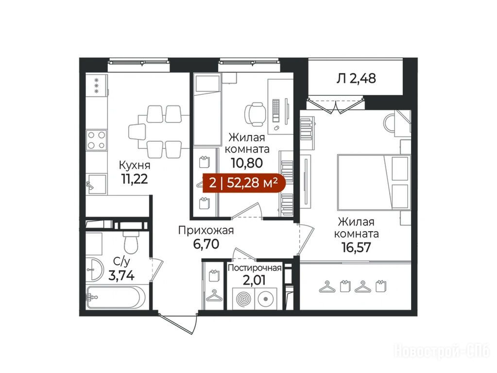 2-комн. квартира, 52.28 м2, 3 этаж