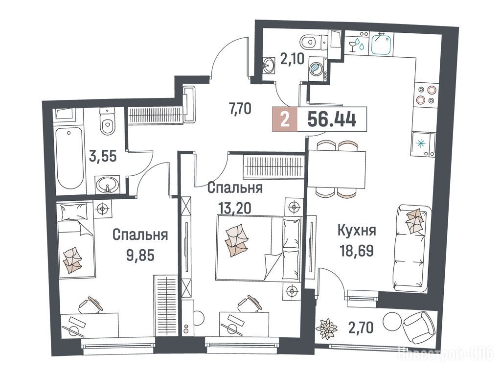 Продается двухкомнатная квартира в новостройке ЖК «Авиатор» по адресу Ленинградская область, Всеволожский район, Мурино, пр-т Авиаторов Балтики, корп. 1. Общая площадь квартиры - 56.44 кв. м. Тип проекта, по которому построен дом — Монолит, компания-застройщик — Инвестиционно-строительная группа «МАВИС», ООО «Максима». Стоимость квартиры — 10 836 480 руб. Способы оплаты можно уточнить у продавца. Срок сдачи — 1 квартал 2027. Более подробная информация по телефону.